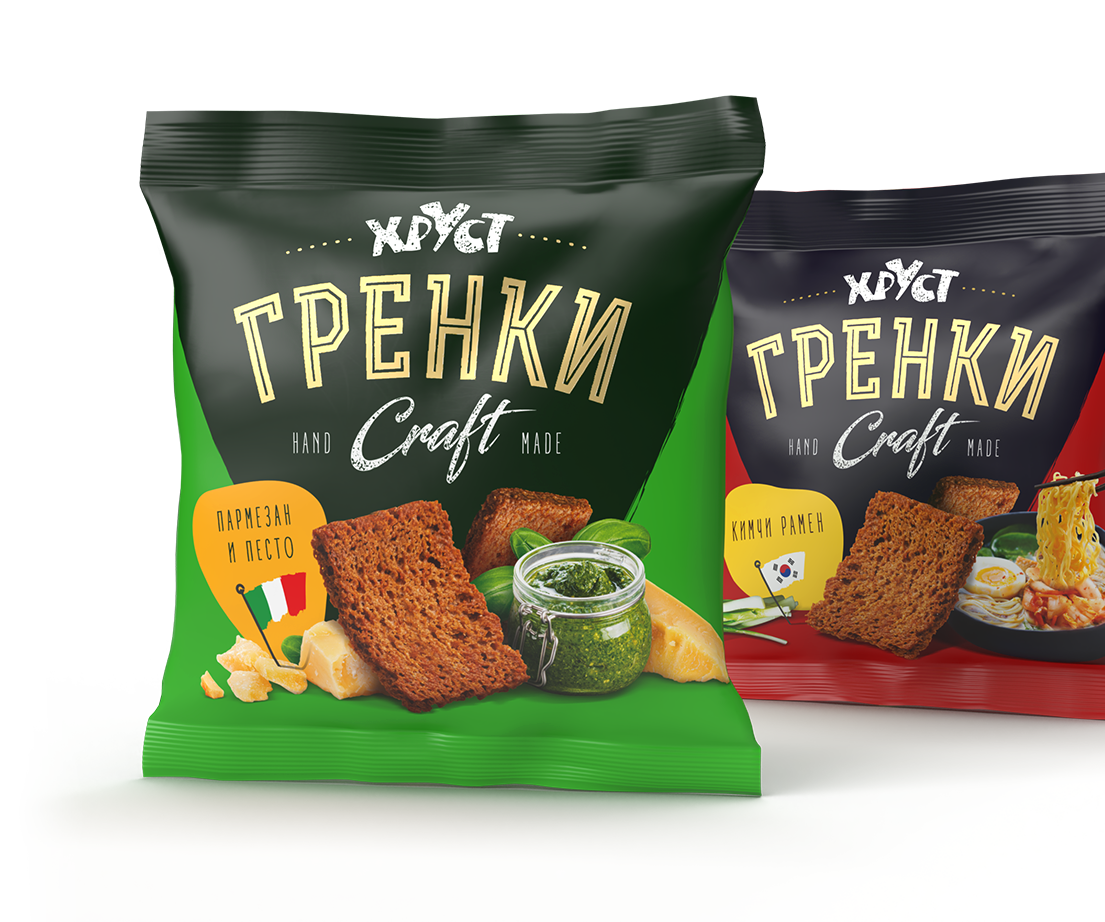 Первой линейкой, которой мы занялись, была серия гренок Craft. Мы решили отойти от банального решения в стиле крафтовой бумаги и рукописных надписей, т.к. эти визуальные образы слишком заезжены и уже не вызывают доверия в ритейле.